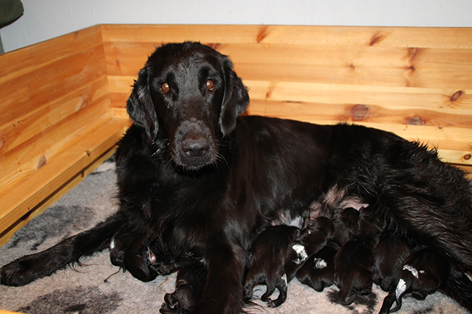 03.10.25. Kimmie har fått en skikkelig jurbetennelse. Noe som ikke er uvanlig med mange valper og masse melk. Den ene puppen vil nok sprekke etter hvert men hun ligger å lar de drikke. Vi gir litt tillegg nå så hun blir litt avlastet . I natt har tempen sunket nedover å hun har det mye bedre. Puppen er stor å hoven men hun vasker valpene sine å er mye kvikkere i blikket . I dag er det ny kontroll på veterinær klinikken. Tusen masse takk for all hjelpen vi får Jeanette . Den er uvurderlig . Å Kimmie er så glad når du hjelper til :-) Valpene er med å de får øvd på bil kjøring i tidlig alder.De vokser så de knaker å har fått god fart på å ake seg rundt i valpekassen. Her er Gutt merket rumpe og jente merket nakken.