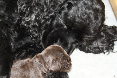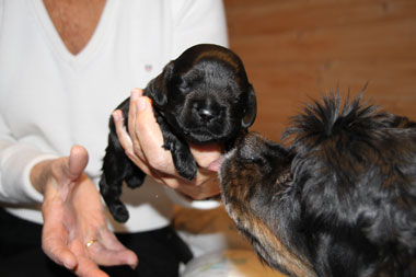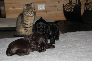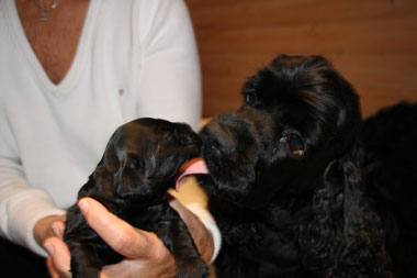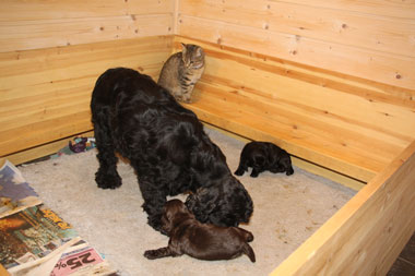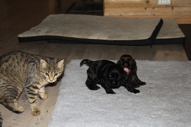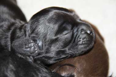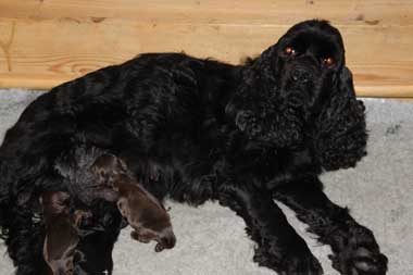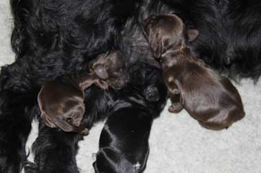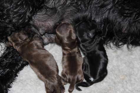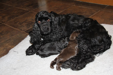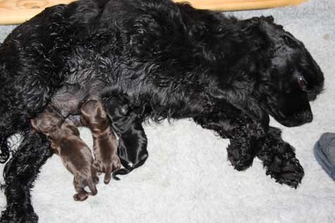17.10.10. Så var første natten gjennom ført. Må jo innrømme at jeg ikke har sovet stort. Med melk en gang i timen og jeg som da sitter å følger med at alle får det de skal så blir det lite søvn. Nå på morgenen har alle lagt litt på seg. Den sorte jenta er ekstrem . Hun ser ut som en liten ball etter hvert måltid. Minste jenta kommer også etter nå. Huff det er alltid spennende de 3 første døgnene om alle klarer seg. Det er i løpet av denne tiden man som regel ser om de er ferdige til å klare den store verden. Men vi krysser fingrene for at lunger og alt annet er klart :-)Med tre valper så kommer de i hvertfall til å få masse oppmerksomhet. Dette blir et ordentlig kose kull.Her er mor og barn nå på morgenen.