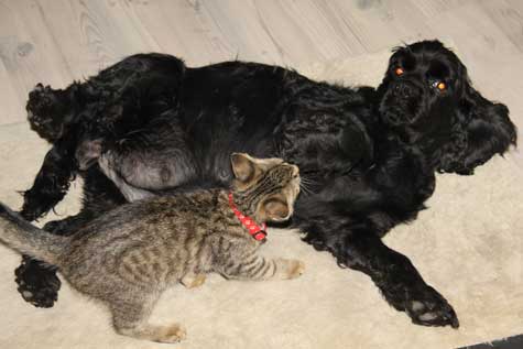 08.10.10. 58 dager på vei.Her er Charmen & Mie. Mie er helt sikker på at Charmen er hennes ekstra mamma. Hun har funnet ut at det masse melk i disse puppene. Og Charmen som er snill som et lam tar seg godt av henne. Nå sparker det godt i magen og matlysten er det så som så med. Ikke lett å få plass til mer i den store magen nå.