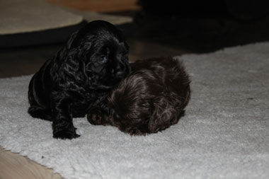 13.11.10. I dag er trolla blitt 4 uker gamle. Tenk at tiden har flydd så fort. De synes det er mest gøy å være uten for valpekassen nå når de er våkne. Men gjett om det er sutring for oppi sengen sin når man blir trøtt. Foran peisen er også et deilig sted å være. Gulvet er heller ikke så glatt mer heldigvis. Lhea som har løpetid må nå være atskilt fra Scott og er barne passer sammen med Charmen til sin store glede. Lhea elsker nemlig alle slik små. Herlig med rumpe vask synes Lhea. Hun skal nå til Sverige for å treffe sin kjæreste å forhåpentlig få noen slike selv igjen.Små trolla synes også det er morsomt med en slik tante. Mie er også utrolig hjelpsom for tiden. Men henne må vi passe litt bedre på. Hun synes de små er veldige morsomme å fange nå :-)Her er Mie,Marley & Diva . Så er det Diva & Marley.