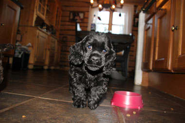 15.11.10. Trolla koser seg med Eukanuba tørr for malt opp til grøt sammen med Cultura. Dette har falt i smak. De traver nå stua rundt på oppdagelse ferd og er ikke så stille og rolige foran peisen mer etter hva jeg får beskjed om :-) Sansene har åpnet seg for at verden er større og mer spennende. Det er så deilig med trygge barnevakter slik at ikke hodet mitt blir helt stresset nå jeg er vekk fra de. Men gjett om jeg savner dem.Alle sammen både katter voksne hunder og valpene. Her er Marley i sengen sin & Diva som leker med nisse ballen.