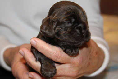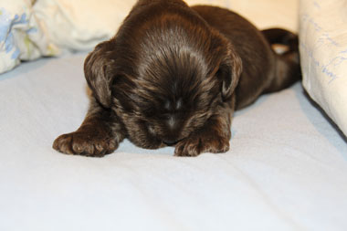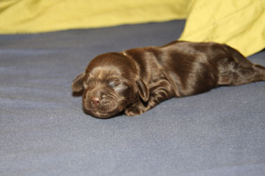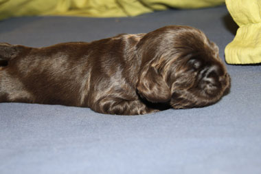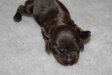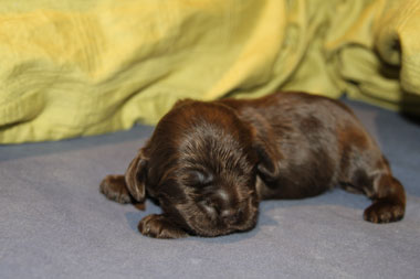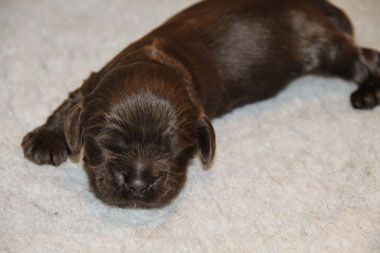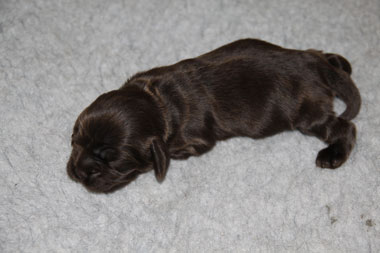 I natt har jeg faktisk sovet en del. Uten å henge ut av senga å titte etter at alle har det bra :-) Hønemor kalles det kanskje. Nå er små trolla blitt 5 døgn gamle. Fra ca 7 til 14 døgn åpner de øynene. Gleder meg masse til at de skal titte på meg med skjønne små blå øyne. Charmen er fremdeles mye inne valpekassen. Tror hun stor trives med å være mamma. Hun ligger å titter på de når de sover. Hun ser ganske så stolt ut. Her er Brun Gutt& Sort jente.
