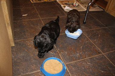 05.11.10. I dag har trolla fått smake sin første hundemat. Det var mye smatting. De klarte jo så klart å kline dette litt utover labbene og gjett om de lå å suttet på hverandre for å få mer :-) Marley var også veldig sikker på at det var noe mer grøt i min finger. Her er Daniel & Diva.
