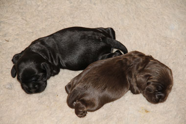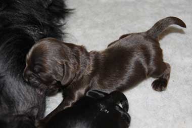 8.10. 2 døgn gamle. De er bare helt til spise opp. Det er noen helt skjønne små runde baller å alle tre.. Minste jenta har også lagt veldig mye på seg så nå begynner de å bli mer jevne. Charmen ble med på tur i går kveld. Hun kosa seg ute en tur ,men bena gikk veldig fort hjem igjen. Så var det rett i valpekassen og opptelling. Å tenk... Ingen hadde rømt :-) Her er sort jente og brun jente.