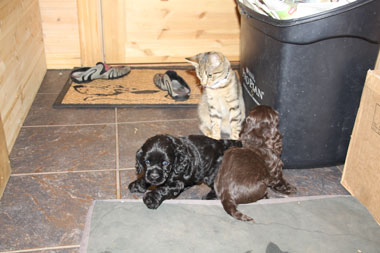 25.11.10. Konsert blir det fort hvis ikke jeg er kjapp nok til å slippe de inn i stua så fort de våkner. Jeg tror ikke noen kan høres så lei seg ut som en amerikaner. Det er ordentlig bhu hu lyd. Charmen hadde noe skikkelige leke runder i stua med knoll og tott i går . Nå er leken virkelig i gang. Mie vil jo også gjerne være med så her er det dyrehage for tiden. Her er Trolla som hjelper meg med å rydde ....... De stikker nesa i alt jeg holder på med og er i bena mine hele tiden. Sko er bann lyst her i huset for tiden.Bare sokke lesten slik at man kjenner det fort hvis man har en liten amrik under foten :-)