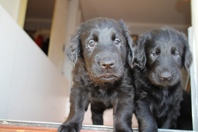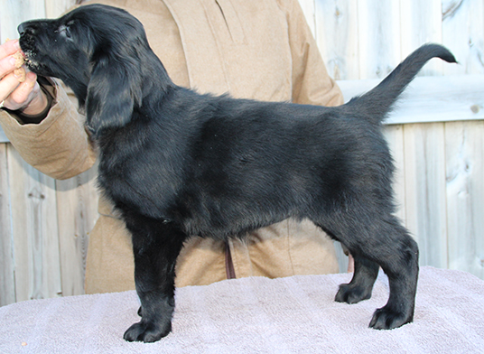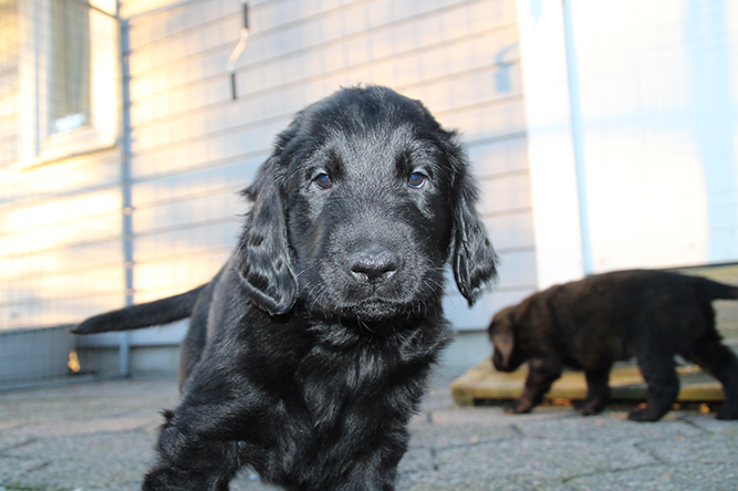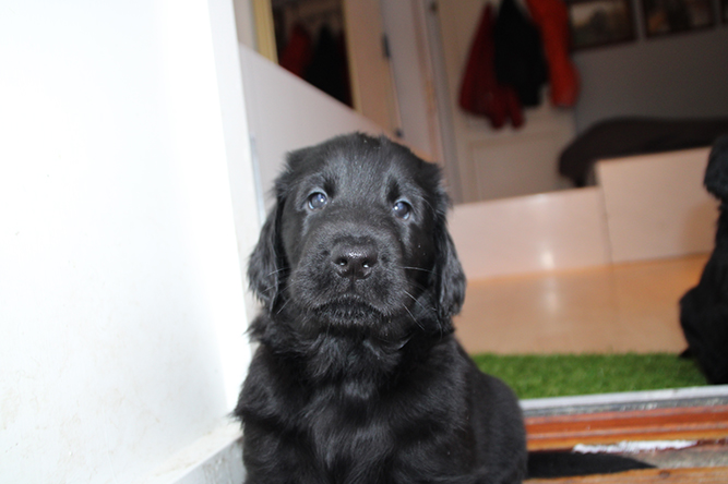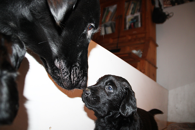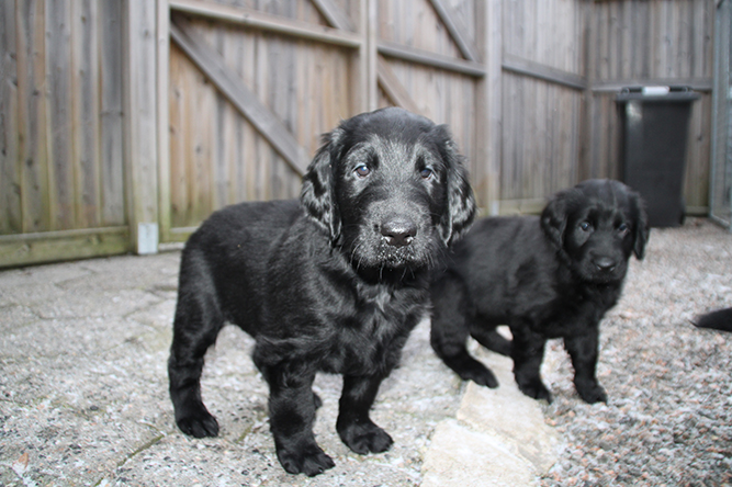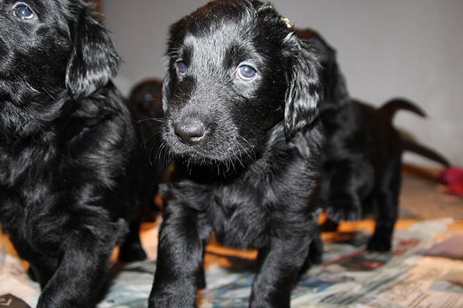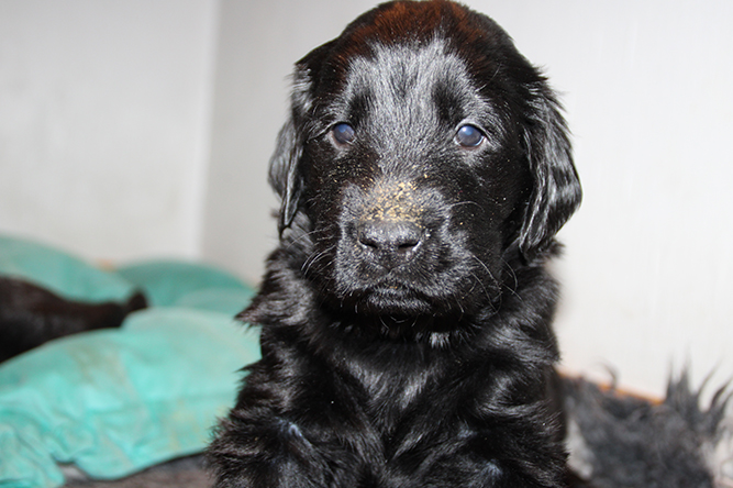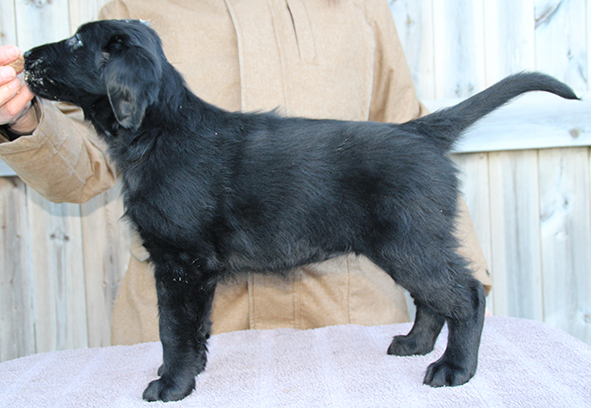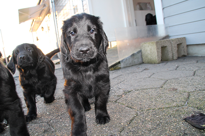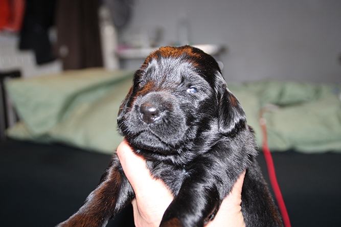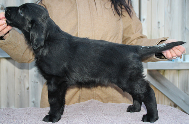 09.02.25.Trolla stor kosa seg med Elin her i går å besøk når vi var borte i går. :-) TUSEN TAKK Elin for en super jobb med de små :-) De hadde fått masse oppmerksomhet og kos :-) I går kveld fikk de være med oss på kjøkkenet når vi spiste middag å det var også gøy. Det var en FANTASTISK dag på utstilling i går. Ecco som onkel ble 2 i champion klassen med CK og 2 beste hannhund totalt av over 80 flatter . Og lille Izie ble nr 1 i junior klassen med CK og fikk Junior certet og junior Cacib. Aia ble nr 2 med CK i bruks hund. Qule Birk ble nr 2 i junior klassen med CK . Samt flere flotte bedøminger av Av- Zan-Iaz hunder :-) CK er en forkortelse av premien Championat kvalitet for de som ikke vet det :-) Så vi var strålende fornøyde. Ikke nok med det vi fikk svaret på Hofte sjekken vi var på med med Izie og Velma hos veterinæren på torsdag . Begge små jentene er HD fri A :-) I dag reiser Kjell på utstilling i retriever klubben med en gjeng mens jeg holder hus her hjemme med besøk gjennom dagen :-) Det er morsdag i dag også så mamma og søster Torun kommer på litt kos midt mellom besøkene. Så dagen er full med mye gøy i dag også :-) Her er jente hode /Frøya og jente rygg /Molly.