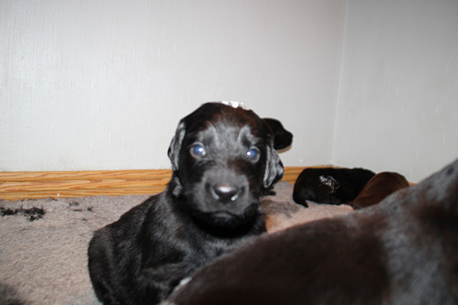 Kl er 21 og det er kommet totalt nå 4 sorte tispe, 1 brun tispe og 2 sorte hanner .Usikker på om det er flere valper men vi mangler en morkake og det kan ligge flere innunder ribbene . vi får bare vente å se her :-)