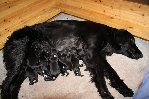 24.03.20. Nå tror vi alle er kommet ut. med morkaker og alt som skal er som det skal :-)Fra første mann kl 07.30 til siste snuppa kl 10.32. så har det gått kjempe fort med 10 valper. Norah er like rolig og flink :-) Vi følger med videre i tilfelle hun skal ha gjemt noen lenger bak men som sagt tror det er tomt. Nå har Norah badet å fått nytt teppe å ligger å koser seg med sine 10 skjønne troll :-)