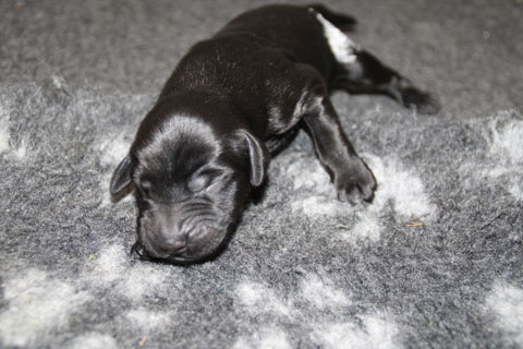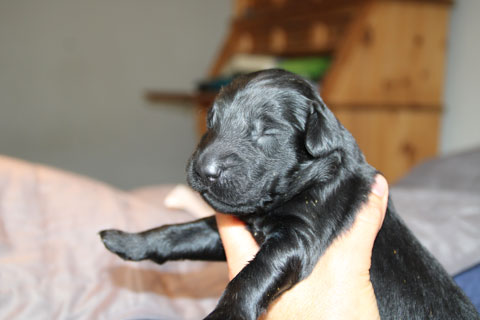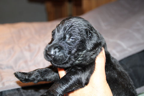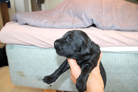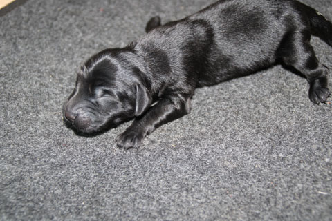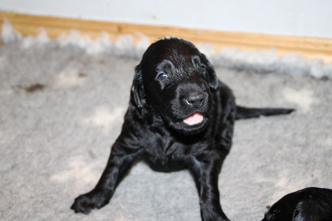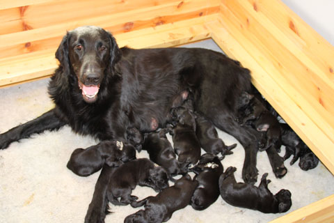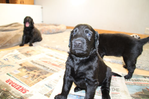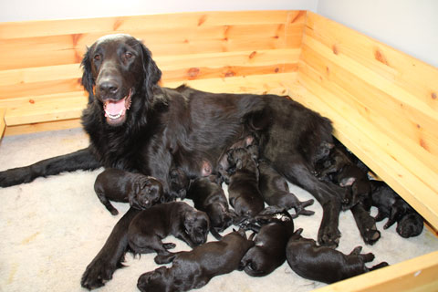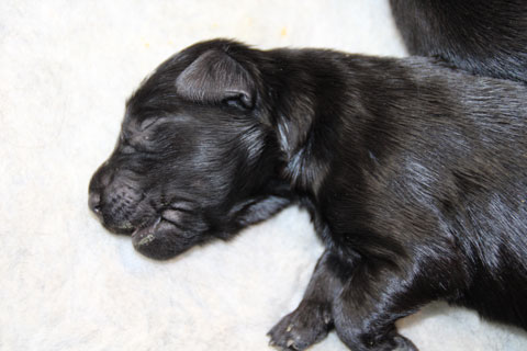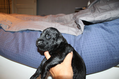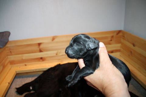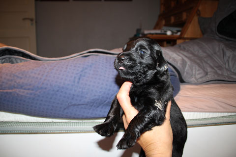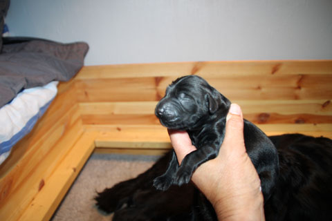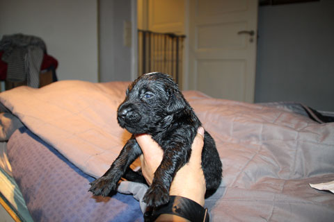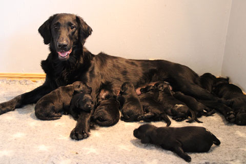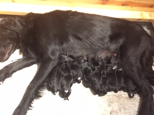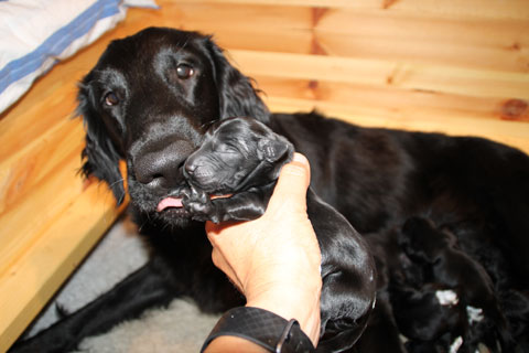 Kl 17.50 De to første valpene er kommet :-) 2 flotte sorte gutter :-) Emma er helt fantastisk med sine skjønne troll. Flere vil ut :-)