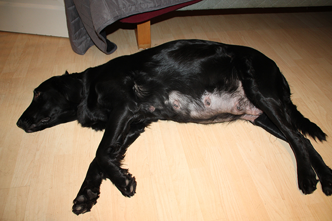 14.11.20. Natten har vært rolig Magen til Allora er helt fin igjen og det er deilig. Tempen holder seg rundt 37,6- 37,8 . Hun har spist frokosten sin . Jeg ser det beveger seg på magen når valpene sparker nå.