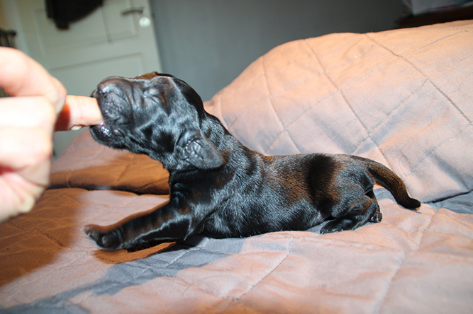01.12.20 . I går fikk de smake litt hundegrøt to ganger. Det er godt det. Merker også at de blir roligere av å få fast føde i magen. Sover lenger mellom melken da. Så det metter mer. Det er trangt i melke baren nå så når Allora legger seg ned for å gi melk må jeg passe på at alle får hver sin pupp. Det er så sinnsvakt trangt :-) I dag jobber jeg en del timer og Nina kommer å passer her fra jeg går til Kjell kommer hjem . Da er de i trygge hender :-)Her er Jhode og gutt hode.