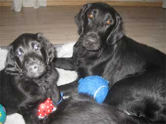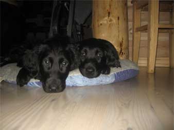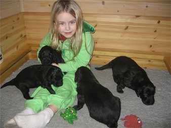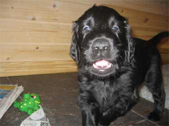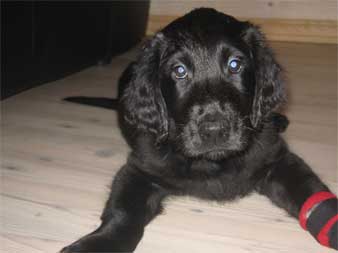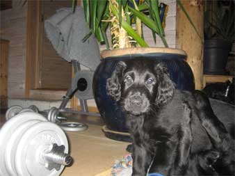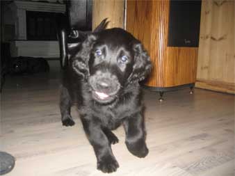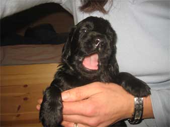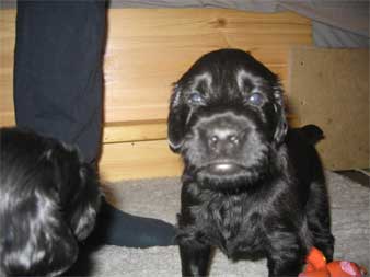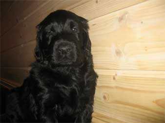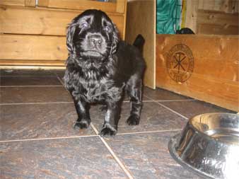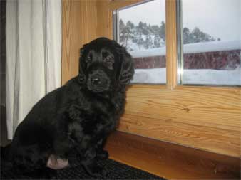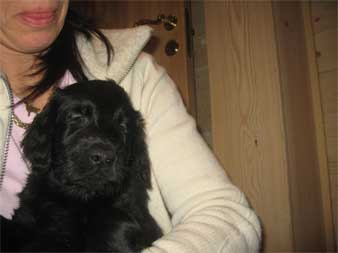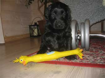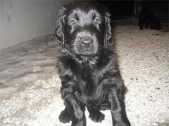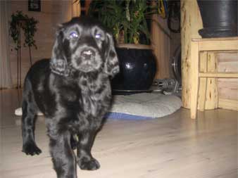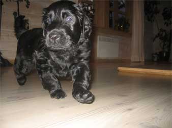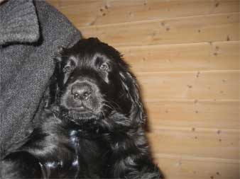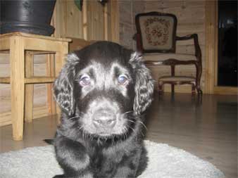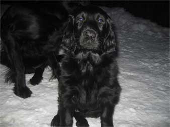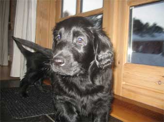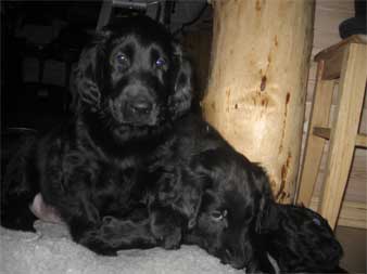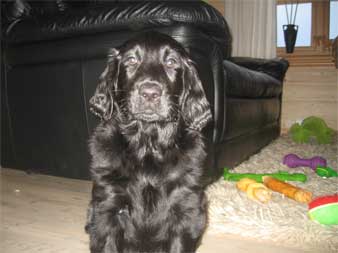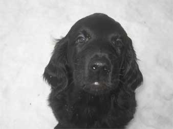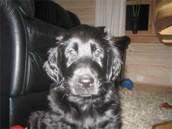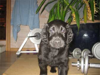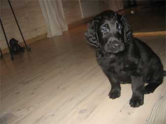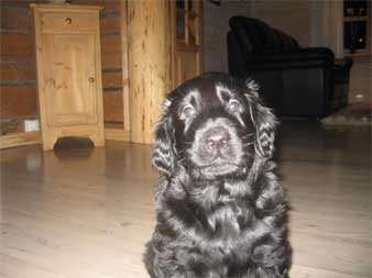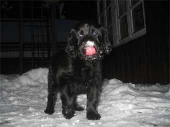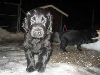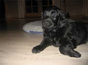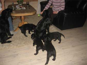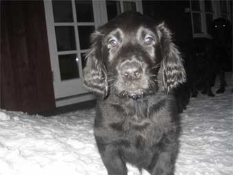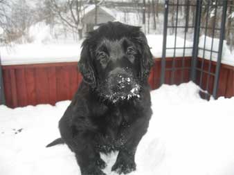 05.02.06. I går kom Karin og Fanny på besøk. Cindy har også vært her i natt. Med 4 voksne flatter ,1 amerikaner og 4 valper i stua så var det livlig. Trolla fiksa det helt topp med andre hunder inn. De er like trygge samme hva vi setter de inn i. Her er alle sammen med Fanny og Karin. Så er det gutt rumpe og jente nakke på tur ute på terrassen. Snø er kult.