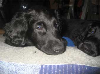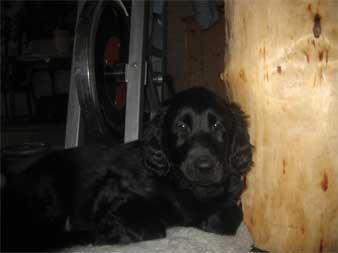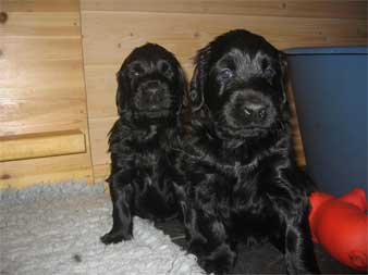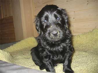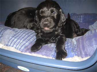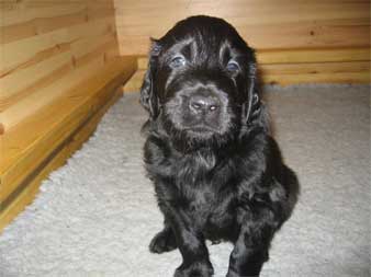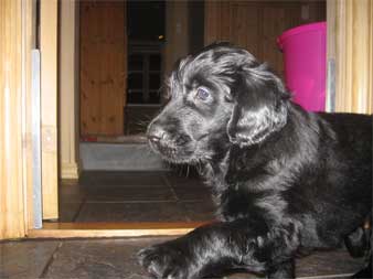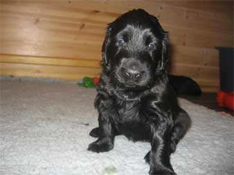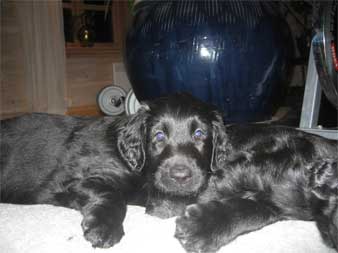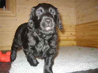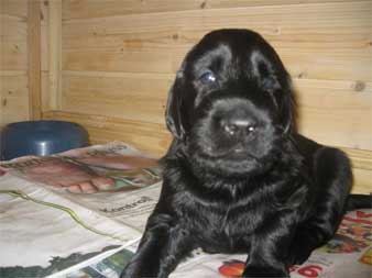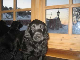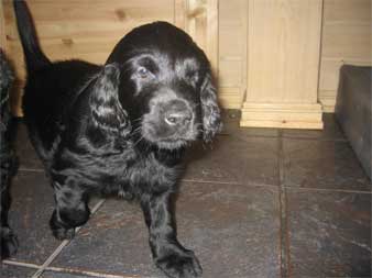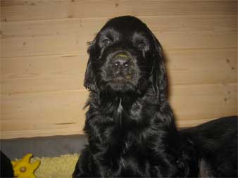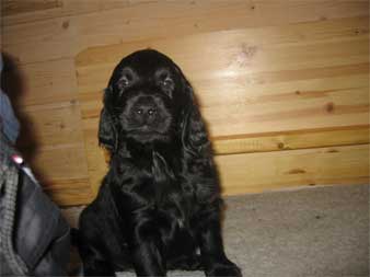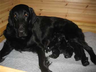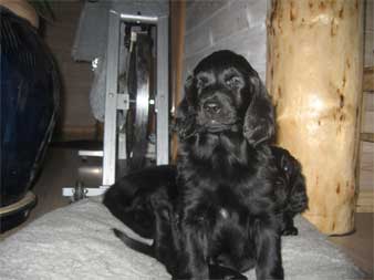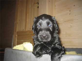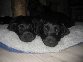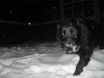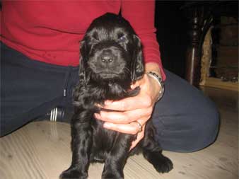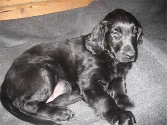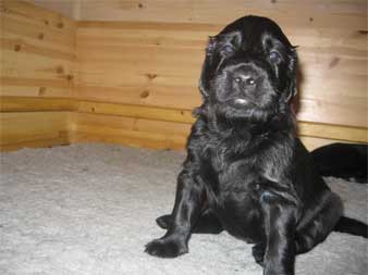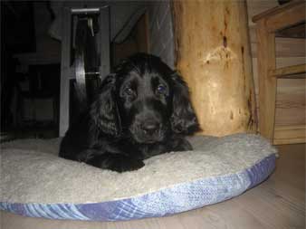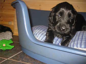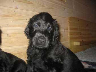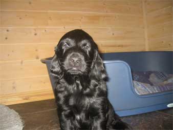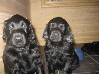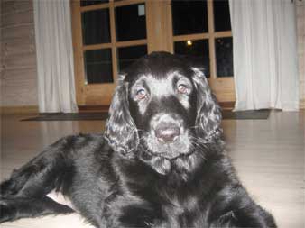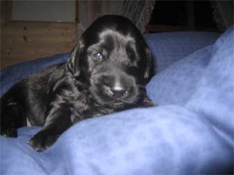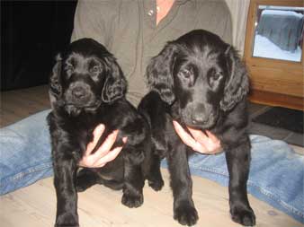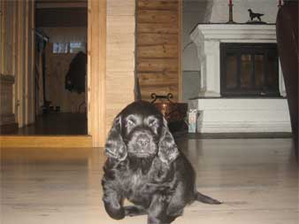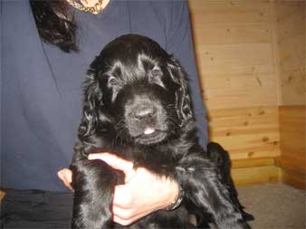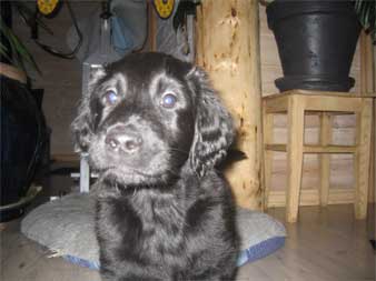 05.02.06. I går kom Karin og Fanny på besøk. Cindy har også vært her i natt. Med 4 voksne flatter ,1 amerikaner og 4 valper i stua så var det livlig. Trolla fiksa det helt topp med andre hunder inn. De er like trygge samme hva vi setter de inn i. Her er alle sammen med Fanny og Karin. Så er det gutt rumpe og jente nakke på tur ute på terrassen. Snø er kult.
