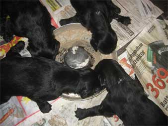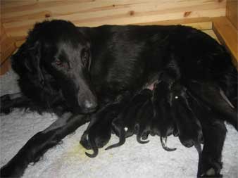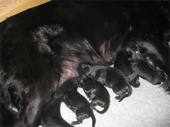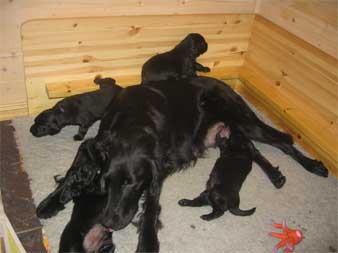 25.12.05. Ja her har det vært lite hyggelig jul aften. I går morges startet Alana med tette veer igjen. Så da bar det av gårde til veterinær for å fått tatt bilde. Det viste at det lå en valp igjen ,antagelig død etter så lang tid og det var bare å dra hjem så ville den komme ut etter hvert. Kort fortalt så ble det opperasjon i morgen timene i dag. Kl 3 i dag morges var jeg desperat på jakt etter en veterinær som gadd å operer henne. Det skal jeg love ikke er lett natt til første juledag. Hun begynte å få veldig høy feber og livmor betennelse Men det har heldigvis gått bra. Valpen er ute og hun ser ut til å komme seg nå. . Har spist litt mat og har vasket litt på valpene sine. Foreløpig så ser det ut som om hun beholder melken. vi krysser fingrene. Så over til hyggeligere ting. Valpene vokser og trives. De er rolige og fine. Alle hadde lagt på seg fra ca 60 gr. og opp over til i går kveld. Her er trollene i full gang med maten. Så er det Alana en smule redusert etter narkosen.