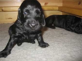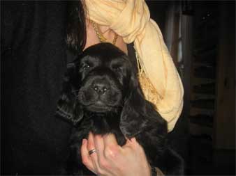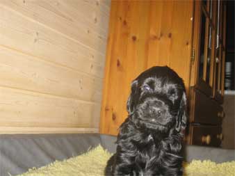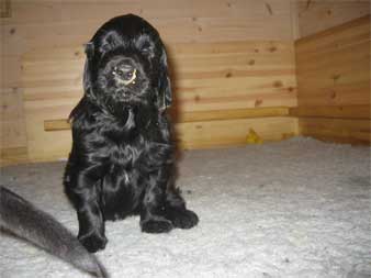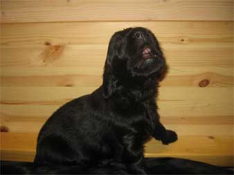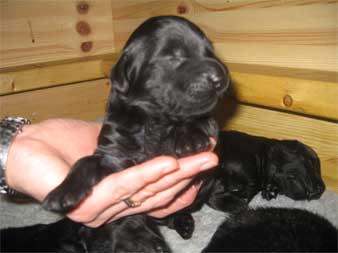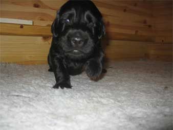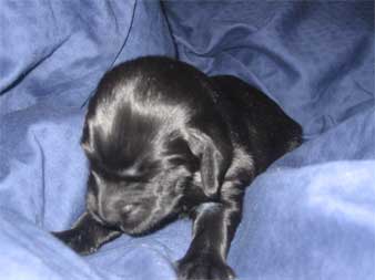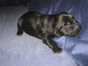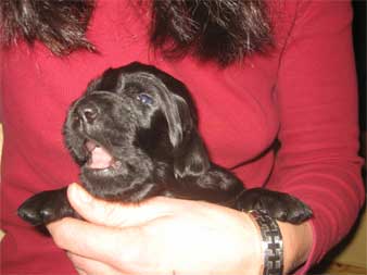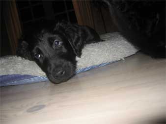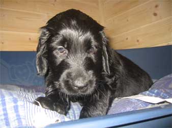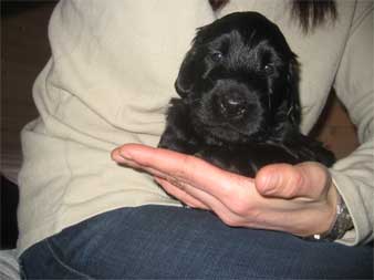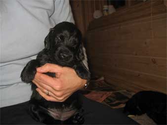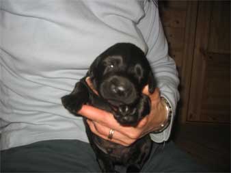 03.01.06. I dag har første mann begynt så vidt å åpne øynene. Det er gutt nakke. Her er han først på leting etter mamma i kassen , så sitter han passe irritert på fanget mitt. Han lukter at Alana står ved siden av og hun er mer fristene en meg. De ser ikke noe særlig de første dagene. Øynene er blå i starten , før de en periode nesten er grå , og så blir de nøttebrune.