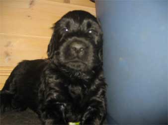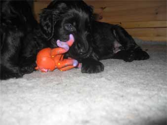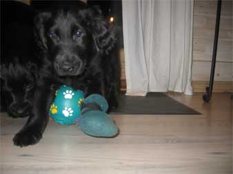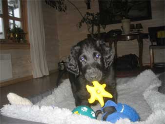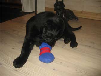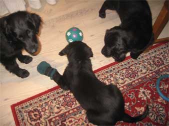 17.02.06. I dag har alle tre vært med meg på øye klinikken. Måtte på sjekk etter en uke å fant ut at de kunne like godt bli med. Det gikk kjempe fint. Både med meg og valpene :-) Her hjemme så har de fått en aktivitets ball. Det detter godbiter ut når de triller på den. Gjett om den er populær. Her er Astrix i aksjon . Han er helt sikker på at han eier den. Så er det alle tre. Det siste bildet er Nikita.