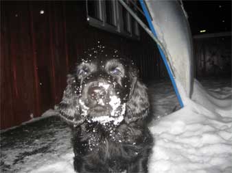 | 01.01.06. Godt nytt år ønsker vi dere alle. I dag har Alana vært med på en liten tur i snøen. Gjett om hun stor koste seg. Trollene blir bare mer og mer til spise opp. Sitter time etter time og ser på at de gjør... ingen ting.... Hundegalskap heter det vist!!!!!! Her er jente nakke som koser seg. |