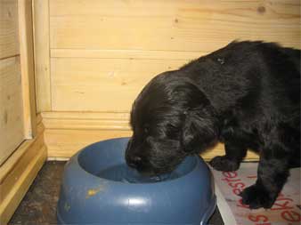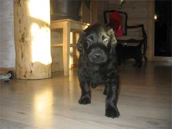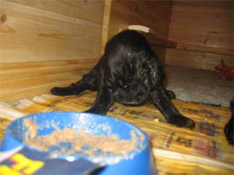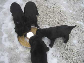 16.01.06. I dag har de fått mat i stor felles skål. De klarer jo å sette bena oppi ,og tråkke så klart i hodet på naboen etterpå. De er helt seige av den feite valpematen. Før de får mat så blåser vi i en fløyte. Dette for å lære innkalling. Trollene har allerede begynt å reagere på lyden nå etter så kort tid. :-) Her er den staute gutt nakke.