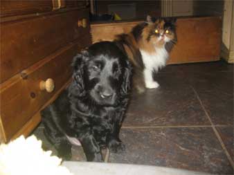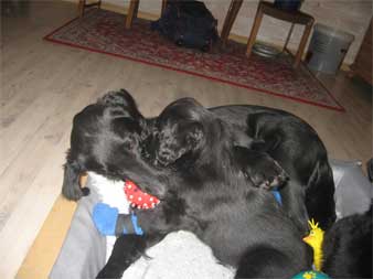 08.02.06. Trolla vil helst både sove og leke i stua hele tiden nå. Det er ville protester når vi sperrer de inne for natta. De hyler ved veranda døra når de må tisse eller bæsje. Det er få dammer vi tørker i løpet av en dag. Dinah -katten- har løpetid nå og er veldig kosete på valpene. Alle de rare lydene hennes lurer de fælt på. Men de drar å haler i henne fra alle kanter ,og hun er kjempe fornøyd med oppmerksomheten. Her er gutt nakke og jente rumpe.