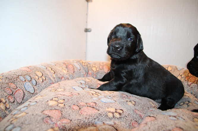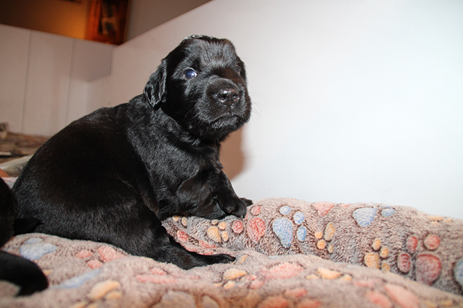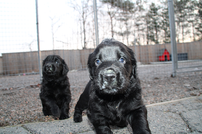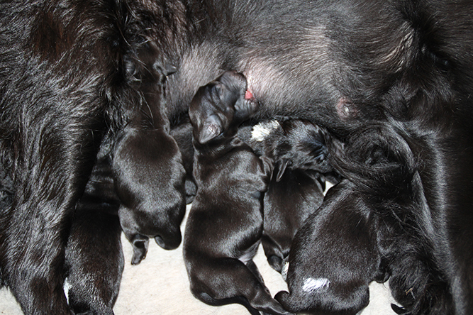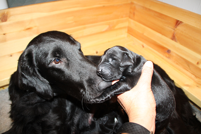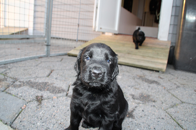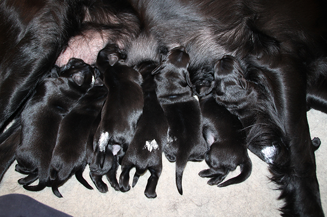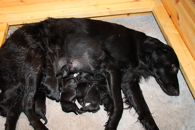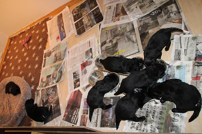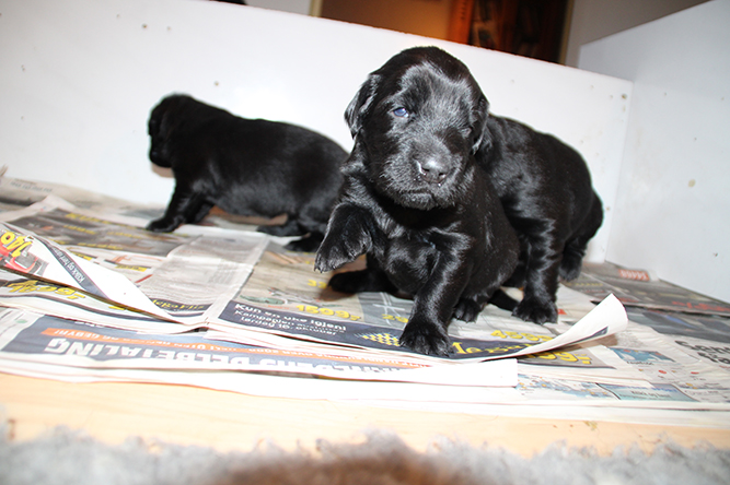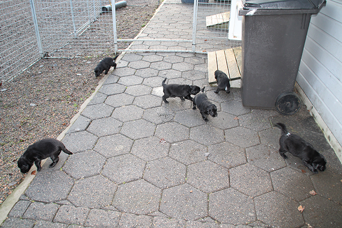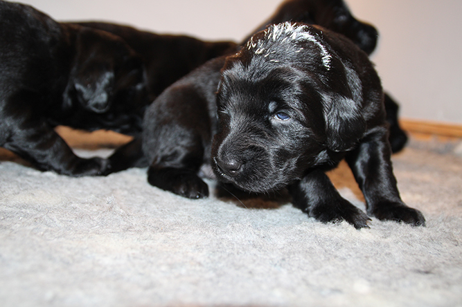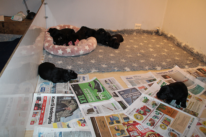 28.10.21. Det er fart i de små sorte gullende når de våkner nå. De åler seg fort gjennom valpekassen på leting etter puppen og melken :-) Ikke alltid like lett å få lagt seg Mille står noen ganger å ser litt fortvilet ned på haugen med skjønneste som åler rundt å funderer tydelig på hvor skal jeg legge meg fort ned så jeg ikke ligger på noen . :-) Hun er kjempe flink :-) Her er jente merket på rumpen og gutt merket på rumpen