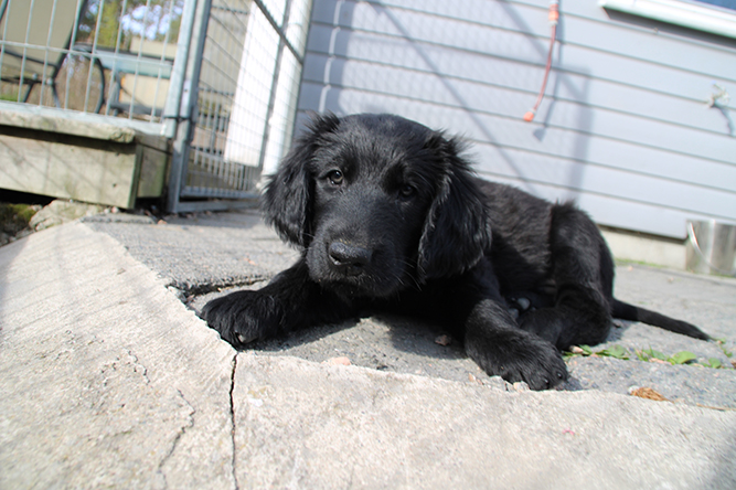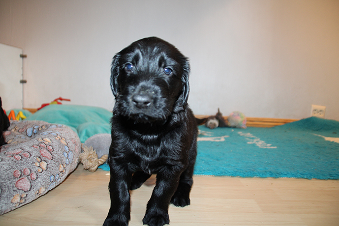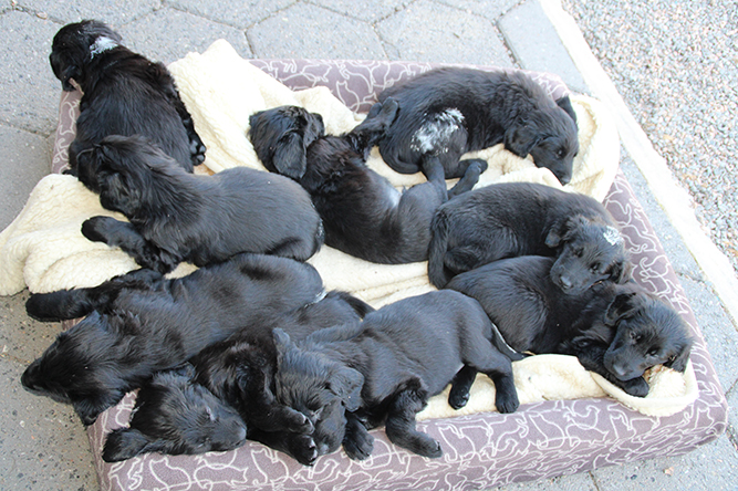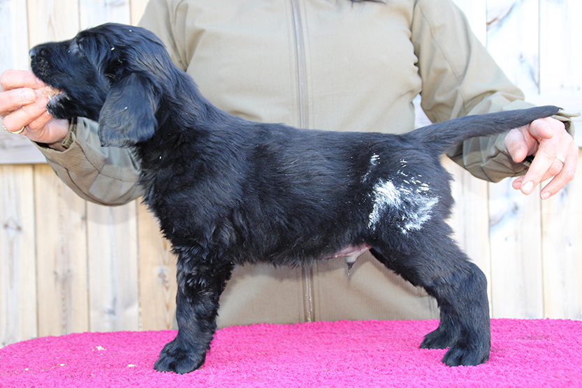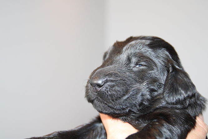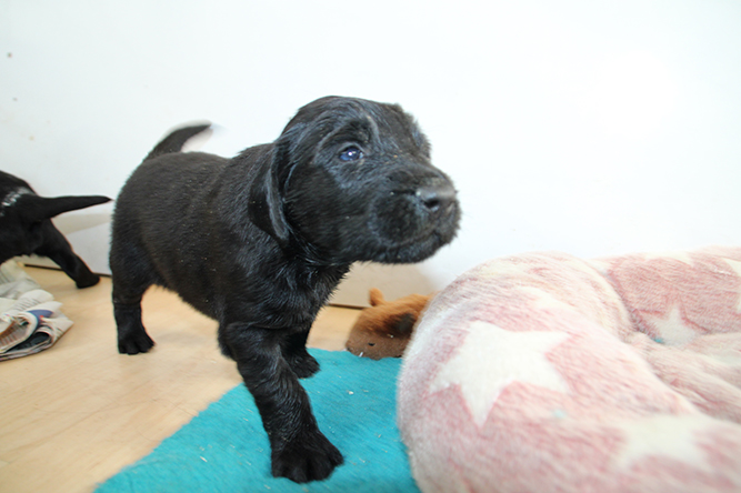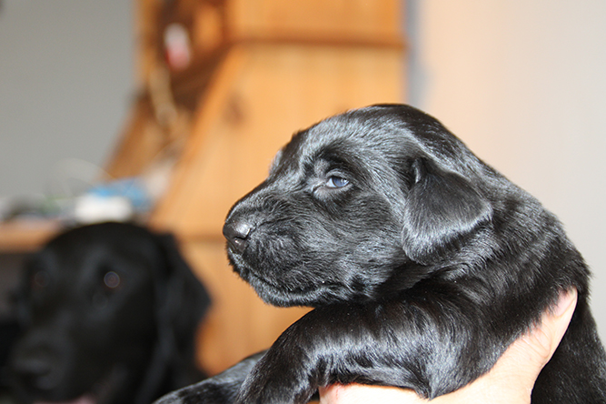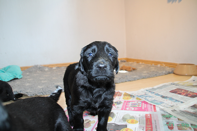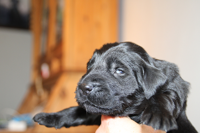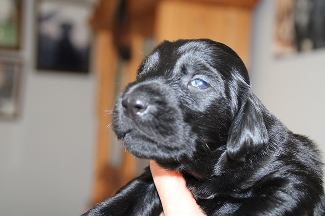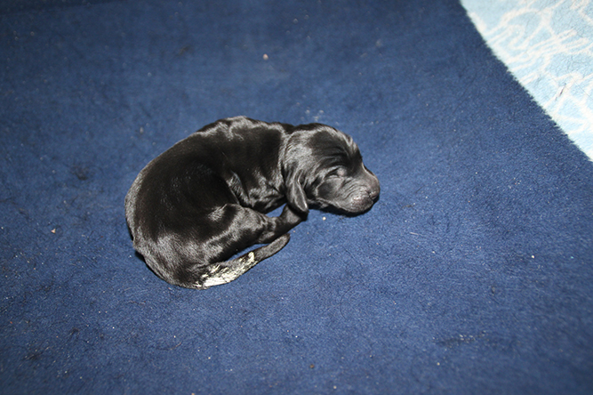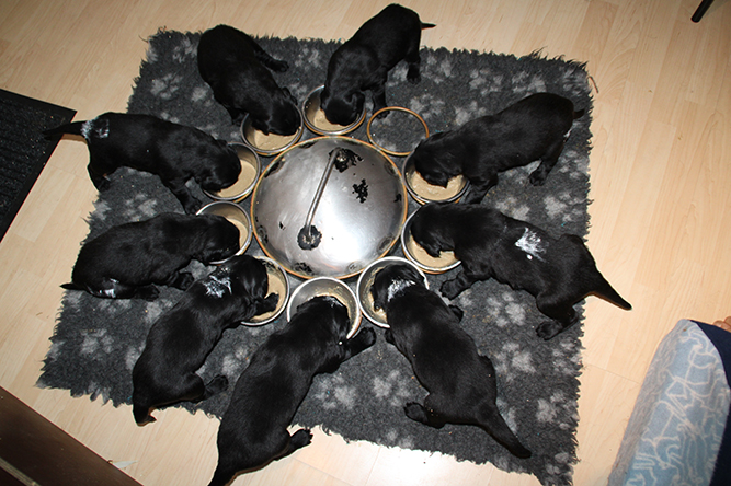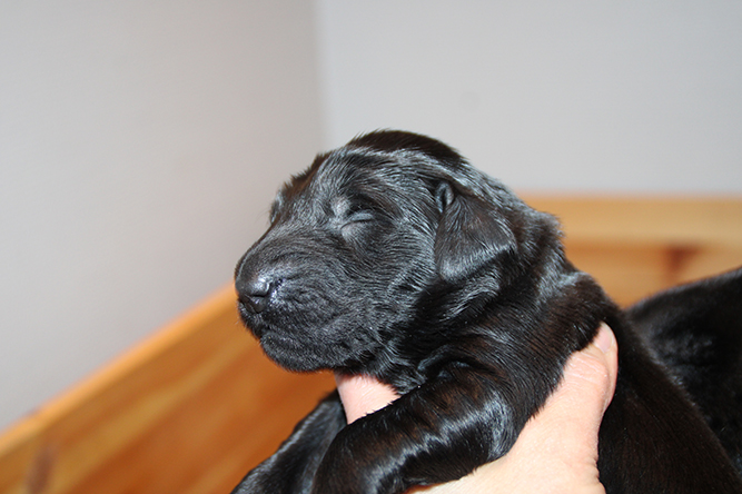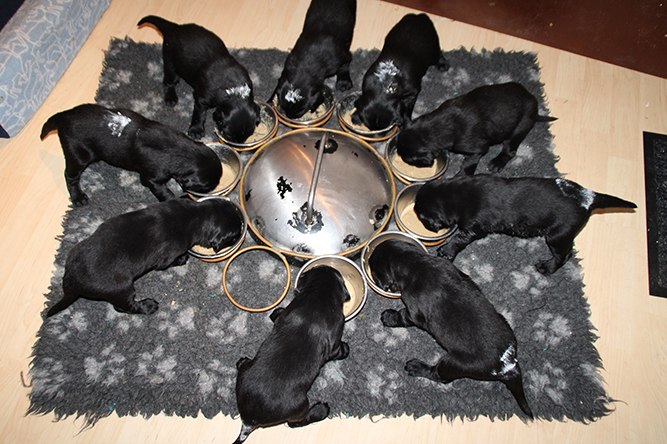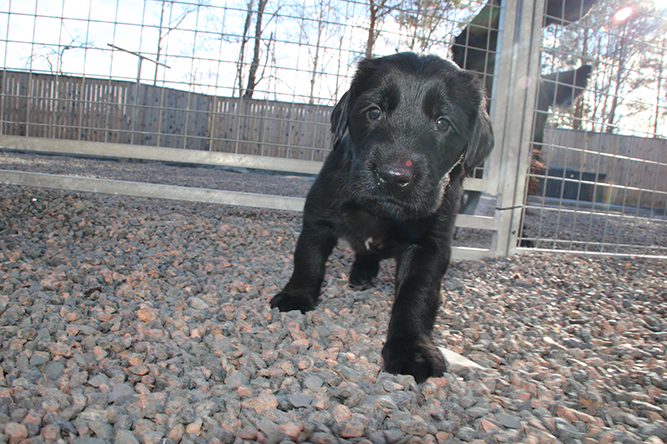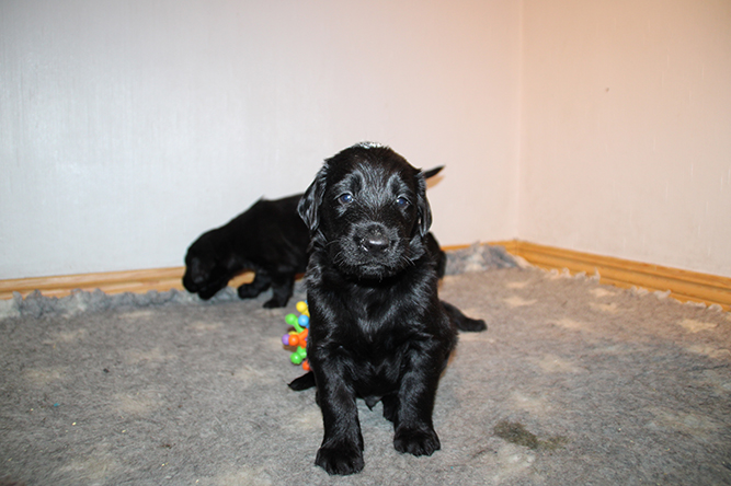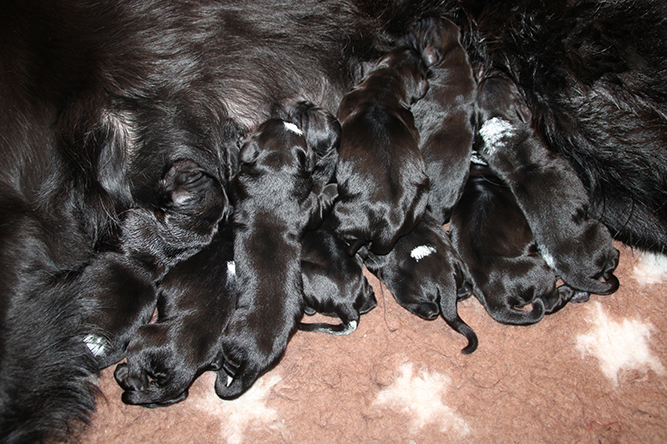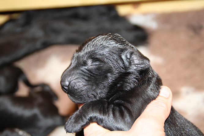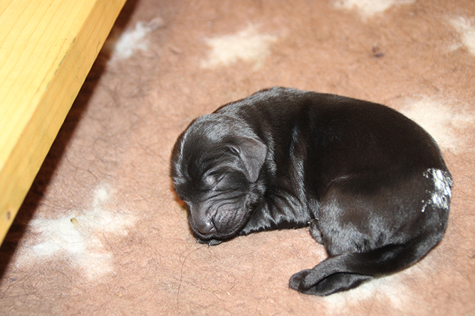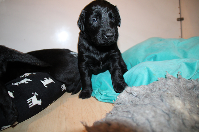 06.04.22. I dag er de skjønne små sorte gullene blitt 4 uker gamle Klo klipp er gjort nå kl 5 å vekten er sjekket ,alt er ok å de er så flinke. Oda fikk forhøyet temperatur i går men heldigvis fikk vi den under kontroll igjen i løpet av kvelden. Hun fikk en jurbetennelse i den ene puppen men er nå i god form igjen heldigvis. Ting skjer fort skal jeg love. Tror hun kan ha fått trekk av den sterke vinden selv om hun går med ull over puppene ute når vi lufter henne. Valpene passer hun godt på å ordner som vanlig her :-) Flinke Oda mamman det :-)Her er jente rumpe og Koda/ gutt rumpe