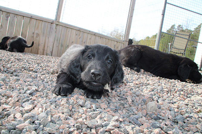 05.05.22. Det er rart med bare tre troll i huset Det synes de også I dag reiser Eros også til sitt nye hjem . Heldigvis er Mila og Saga sammen til i morgen. Alle 9 synes nok det er trist å miste alle søsknene sine. De er jo vant til at det alltid er noen der . Pass på at deres troll ikke blir alene nå i starten Det er bare trist for en liten valp. De trenger masse kos og oppmerksomhet så de føler seg trygge i sine nye hjem. De vil være der vi er siden de er vant til å være sammen hele tiden :-) Når man begynner å øve på korte økter alene så gjør man det når valpen er sliten å vil sove. Da kan man la den være alene 10-15 in av gangen å gå i et annet rom. Ha gjerne på en radio så den hører lyder å er trygg. Ikke start med for tøffe alene tider Dere får bare smellen når valpen blir eldre å det kan fort få litt seperasjons angst. Valpene er også nå renslige De har tisset og bæsjet ute nå et par uker. Så ingen aviser inne og pass på når den våkner å lær den hvor deres dør er ut Bær den gjerne nå i starten så den rekker ut :-) Her er Eros og Mila