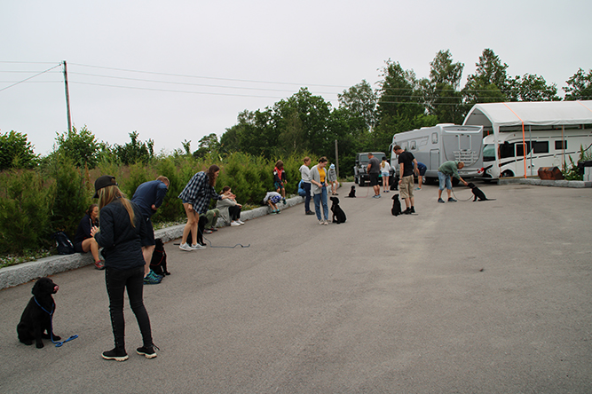 Etter en god økt med dette så alle har noe å fortsette med å trene hjemme så tok vi en velfortjent lunsj med grilling å skravling. Samt utstyr for de som ønsket det fra Musti til gode priser :-) Det er så deilig når man kan snakke med andre med valp på samme aldre å dele sorger og gleder :-) Etter den første økten var jo trolla vel slitne. Men vi viste felt søk og hvordan man lærer inn dette. Husk at 5 minutters søk tilsvarer faktisk en halvtimes tur med hodebruken :-) Trolla var flinke å løp ut å jobbet. Innkomstene må vi jobbe litt mer med men jammen var de flinke :-)