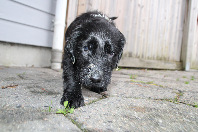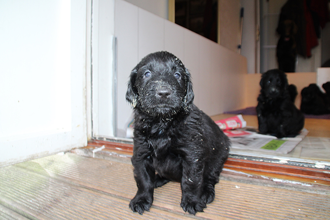 14.10.25. Utviklingen går i 100 her. I dag må vi åpne mer plass . De er blitt sykt flinke til å gå ut på avisene å gjøre i fra seg. I dag skal de få "gressplen" ved døren .jeg skjønner faktisk ikke hvordan folk klarer å ha valper  i en liten valpekasse frem til 3 ukers alder. For her går det unna. De våkner å går helt ned i andre enden av innhegningen sin . Å de vokser så det knaker så det blir jo fort trangt. Hørselen har nå åpnet seg å de hører veldig godt når vi kommer inn i rommet. Da blir det liv :-)Her er gutt halen og gutt hode