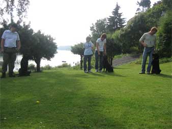 Endelig var dagen her hvor Nikkens søster og bror skulle være med på valpetreff. Dette var jo et lite kull på bare 4 valper og Astrix kunne dessverre ikke komme i dag. Han var her en tur for en uke siden i stedet .Så i dag har vi hatt god tid til alt. Vi startet dagen i skogen med feltsøk for trollene. Søks evnen er i god behold hos alle tre. Vi fikk to fine søk med både Kira og Zorro. Etter dette så prøvde vi med skudd og apportering i vannet. Dette gikk også kjempe flott. Ingen skudd redde hunder her nei. Kjell fikk også gått igjennom en del med markering og dirigering. Etter dette fikk valpene fri til lek i vannet en stund. Gjett om det var toppen etter all hodebruken. Så fortsatte vi med lydighets øvelser som bli sittende, bli liggende, fri ved fot ,innkalling og hopp over hinder. Dette er rolige oppmerksomme valper. Flott med den samhørigheten dere har fått til med hunden deres.