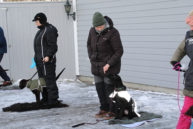 Vi var veldig heldige med været selv om det var litt kaldt :-) Vi fikk godt igjennom på plass , sitt bli sittende ,dekk,bli ligende, stå , bli stående og innkalling. Da var valpene kjempe slitne å klare for en lunsj. Det var vi to bente også :-)