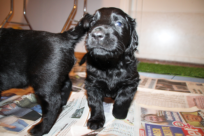 25.11.25.Tenk i dag flytter det 4 små troll. Belle, Pia, Viktor og Tarzan reiser. De er veldig klare å vi gruer oss :-) Å det er 4 familier som gleder seg helt sykt . Når dere får bebyen deres hjem så husk det er små bebyer lenge enda. Alt skjer etter dens behov. Den sover når det absolutt ikke passer . Den vil ut når den har sovet, midt i leken og enda et par ganger til :-) Vær obs på¨kulden . Det er kaldt for en liten kropp ute nå, men vi må jo litt ut også. Korte økter ute å gjerne bruk en genser ellet et lite dekken. Den er ikke vant til å gå med hals bånd så den kommer til å klø seg etter dette. Sett det på når valpene er veldig våken å ta det av igjen når den blir for irritert av det. Øv ofte og kort tid. Star å trene med glad og hyggelig lydighet med en gang . Korte økter her også. Si nei til de tingene den ikke får lov til. Den skjønner fort hva dere ønsker og ikke. Si nei til biting i ben og hender. De små valpe tennene er utrolig skarpe så stopp det med en gang. Vi lar de ikke få lov å tygge på oss. Da er det et fast nei å slutt. Gi den noe godt å tygge på som grise øre eller grisehaler. Da tygger den på det i steden.Ta den med dere i bilen på turer å øv på dette også. Ikke vent :-) Å det er lov å ringe oss døgnet rundt for hjelp å råd :-) I går lekte de masse i gangene og på rommene utenfor valperommet sitt. Det er bare så spennende å urforske alt som er. Å jeg må også redde ting som de ikke får tygge på. Her er Hugo og Oline.